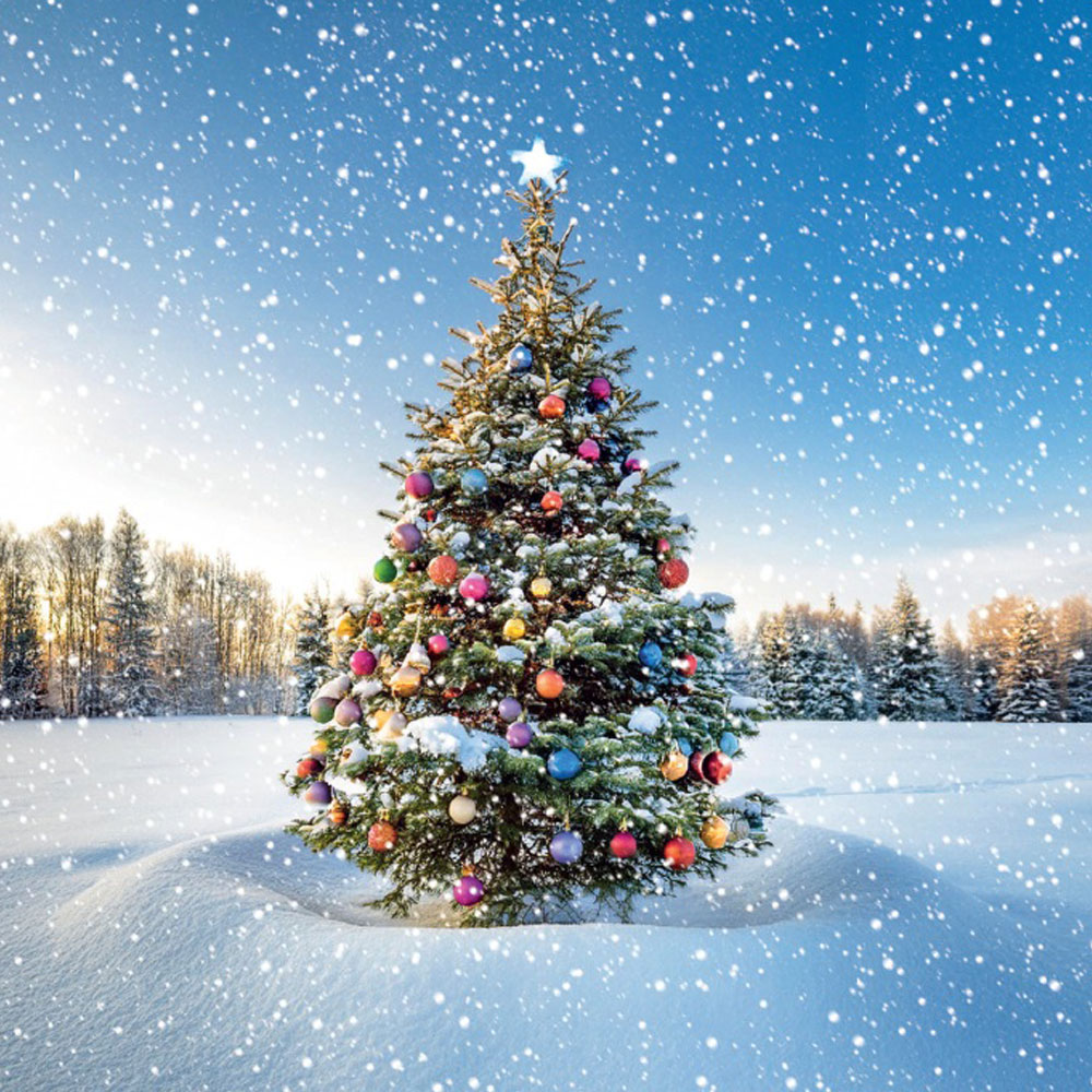 This wintery Christmas card features an impressive winter landscape. A distinguished Christmas tree, decorated with vibrant baubles and crowned by a shining star, stands prominently in a snow-blanketed field. With gently falling snow completing the scene, this card is an excellent choice for anyone who loves Christmas.
